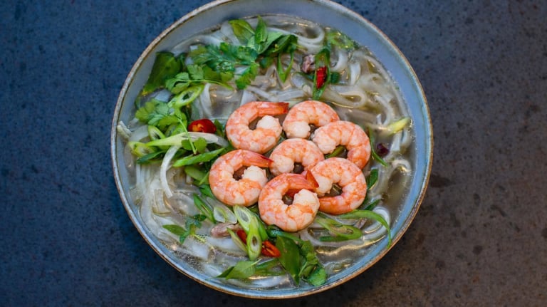 Фьюжн фо с креветками — это современная интерпретация классического вьетнамского супа фо, идеально подходящая для тех, кто предпочитает изысканный вкус морепродуктов. Сочные креветки сочетаются с ароматным прозрачным бульоном и свежими травами, создавая лёгкое и одновременно насыщенное вкусовое впечатление.